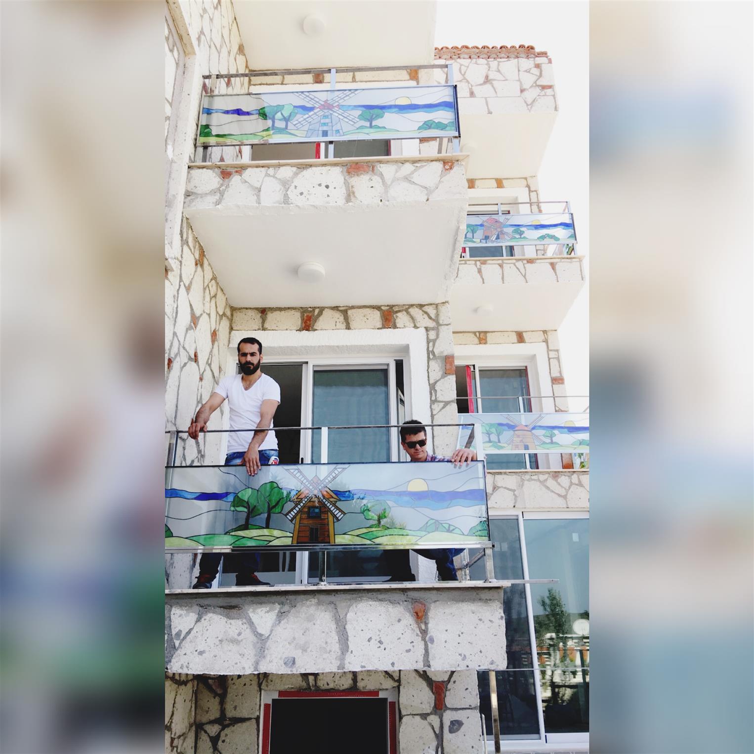İzmir Alaçatı da Boağaziçi Restaurant ın sahip olduğu Boğaziçi Restaurant butik otelenin merdiven trabzanlarına özel tasarım ve uygulama yapılan renkli camlar ile vitray uygulmasıdır.